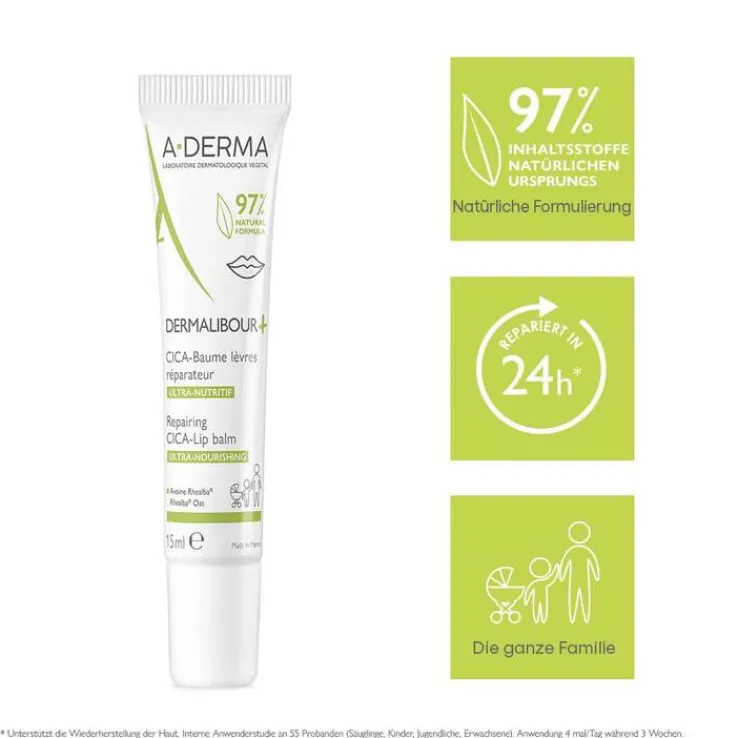 Der A-Derma Dermalibour + Cica Lippenbalsam repariert empfindliche, rissige, trockene und gereizte Lippen in 24h. Der Lippenbalsam sorgt für die sofortige Steigerung des Lipid Anteils um das 5-Fache* nach der Anwendung. Er eignet sich für Säuglinge, Kinder und Erwachsene und ist frei von Duftstoffen, Mineralöl und PEGs. 97,5 % der Inhaltsstoffe sind natürlichen Ursprungs.
