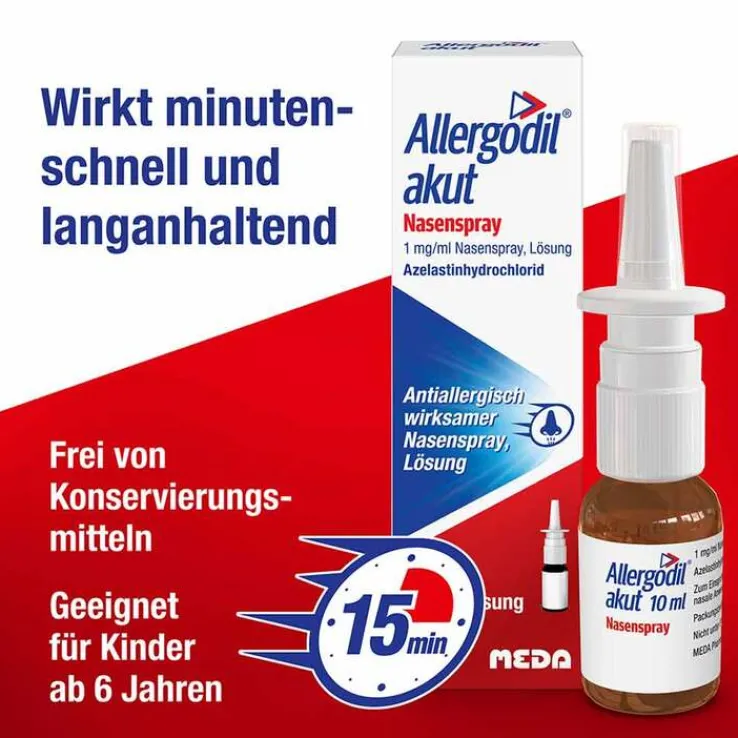 Allergodil® akut Nasenspray. 1 mg / 1 ml, Nasenspray, Lösung. Wirkstoff: Azelastinhydrochlorid. Anwendungsgebiet: Allergodil® akut Nasenspray: Symptomatische Behandlung von Heuschnupfen (saisonale allergische Rhinitis) bei Erwachsenen, Jugendlichen und Kindern ab 6 Jahren. Stand: 12/2022. Apothekenpflichtig Viatris Healthcare GmbH, Lütticher Straße 5, 53842 Troisdorf Zu Risiken und Nebenwirkungen lesen Sie die Packungsbeilage und fragen Sie Ihre Ärztin, Ihren Arzt oder in Ihrer Apotheke.
