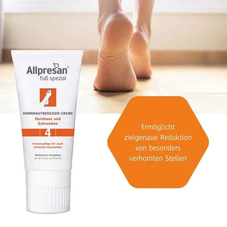 Die Allpresan Fuß spezial Hornhautreduzier-Creme 4 gegen Hornhaut und Schrunden 1-2x täglich nach Bedarf gezielt auf die gereinigten und verhornten Stellen auftragen.