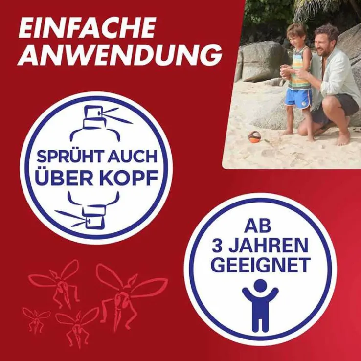 Um den Schutz gegen Mücken und Zecken zu aktivieren und aufrecht zu erhalten, tragen Sie das Insektenmittel gleichmäßig auf die zu schützenden Hautflächen oder Textilien auf und erneuern Sie den Schutz nach Ablauf der Wirkdauer regelmäßig.