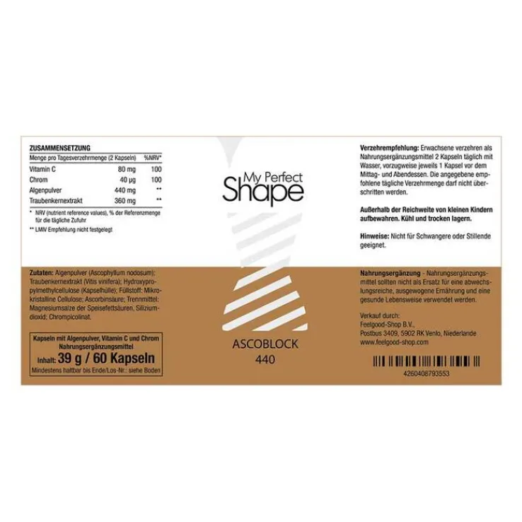 Algenpulver (Ascophyllum nodosum); Traubenkernextrakt (Vitis vinífera); Hydroxypropylmethylcellulose (Kapselhülle); Füllstoff: Mikrokristalline Cellulose; Ascorbinsäure; Trennmittel: Magnesiumsalze der Speisefettsäuren, Siliziumdioxid; Chrompicolinat.