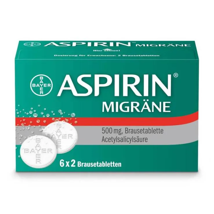 Aspirin® Migräne Wirkstoff: Acetylsalicylsäure Anwendungsgebiete: Akute Behandlung der Kopfschmerzphase von Migräneanfällen mit und ohne Aura. Hinweis: Enthält Natriumverbindungen. Bitte Packungsbeilage beachten! Zu Risiken und Nebenwirkungen lesen Sie die Packungsbeilage und fragen Sie Ihre Ärztin, Ihren Arzt oder in Ihrer Apotheke. Bayer Vital GmbH, 51368 Leverkusen, Deutschland