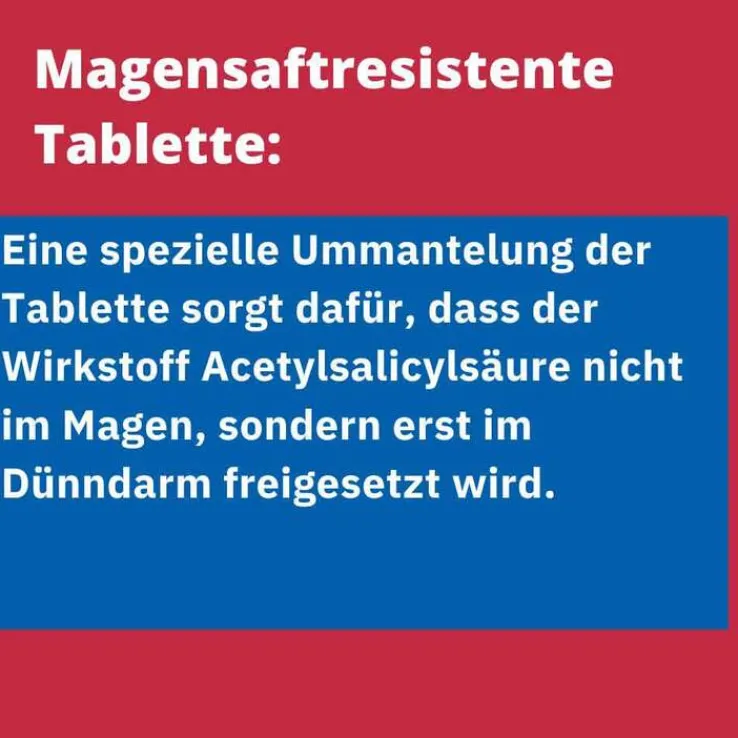 - MAGENSAFTRESISTENT: Eine spezielle Ummantelung der Tablette sorgt dafür, dass der Wirkstoff Acetylsalicylsäure nicht im Magen, sondern erst im Dünndarm freigesetzt wird.
