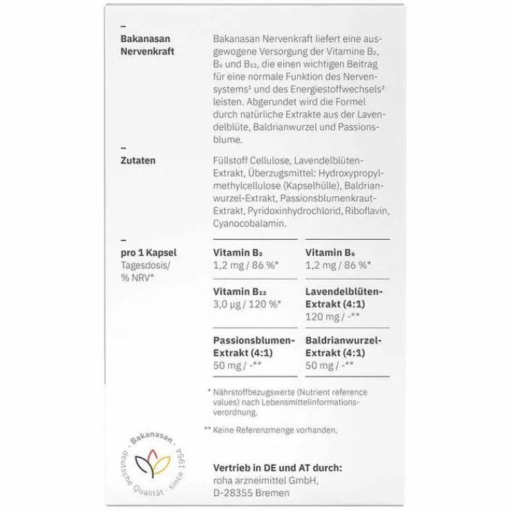 Bakanasan Nervenkraft Plus liefert eine ausgewogene Versorgung der Vitamine B2, B6 und B12, die einen wichtigen Beitrag für eine normale Funktion des Nervensystems* und des Energiestoffwechsels* leisten. Abgerundet wird die Formel durch natürliche Extrakte aus der Lavendelblüte, Baldrianwurzel und Passionsblume.