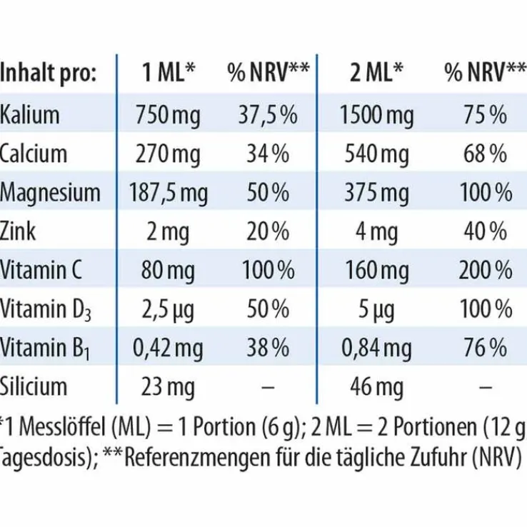 * Zink, Vitamin D und C tragen zu einer normalen Funktion des Immunsystems bei. Zink trägt zur Erhaltung normaler Haare bei. Zink trägt zur Erhaltung normaler Nägelbei. Zink trägt zur Erhaltung normaler Haut bei. Zinkträgt zu einem normalen Säure-Basen-Stoffwechsel bei. Magnesium, Calcium und Vitamin D tragen zur Erhaltung normaler Knochen und normaler Zähne bei. Magnesium und Kalium tragen zu einer normalen Muskelfunktion bei. Magnesium und Kalium tragen zu einer normalen Funktion des Nervensystems bei. Kalium trägt zur Aufrechterhaltung eines normalen Blutdrucks bei. Eine Reduzierung der Natrium-Aufnahme trägt zur Aufrechterhaltung eines normalenBlutdrucks bei. Vitamin B1 trägt zu einer normalen Herzfunktion bei. Magnesium trägt zu einem normalen Energiestoffwechsel bei. Magnesium trägt zur Verringerung von Müdigkeit und Ermüdung bei. Calciumträgt zur normalen Funktion von Verdauungsenzymen bei. Vitamin C trägt zu einer normalenKollagenbildung für eine normale Knorpelfunktion bei. Magnesiumträgt zur normalen psychischen Funktion bei.