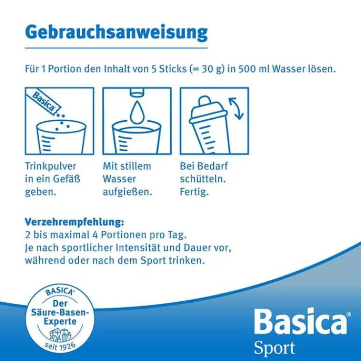 Pro Portion 30 g (5 Messlöffel bzw. 5 Sticks) in 500 ml Wasser auflösen. 2 bis maximal 4 Portionen pro Tag. Je nach sportlicher Intensität und Dauer vor, während oder nach dem Sport trinken.
