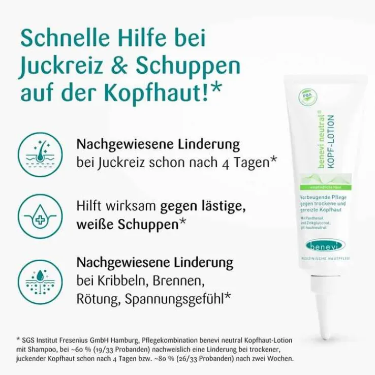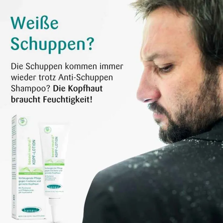 Trockene Kopfhaut ist eine häufige Ursache für Juckreiz und weiße Schuppen. Die Benevi Neutral Kopf-Lotion wurde speziell entwickelt, um genau hier anzusetzen: Sie spendet gezielt Feuchtigkeit, beruhigt irritierte Hautpartien und hilft so, Juckreiz und Schuppenbildung zu mindern – ganz ohne Auswaschen.
