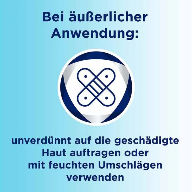 - Für die äußere Anwendung gilt: Unverdünnt auf die betroffene Hautstelle auftragen oder alternativ mit feuchten Umschlägen anwenden.