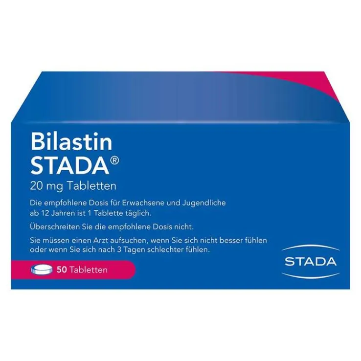 Bilastin STADA® 20 mg Tabletten. Zur Anwendung bei Erwachsenen und Jugendlichen ab 12 Jahren Wirkstoff: Bilastin. Linderung der Beschwerden von Heuschnupfen (Niesen, juckende, laufende, verstopfte Nase und rote und tränende Augen) sowie anderer Formen allergischer Rhinitis. Es kann auch angewendet werden, um juckende Hautausschläge (Nesselsucht oder Urtikaria) zu behandeln. Hinweis: Überschreiten Sie die empfohlene Dosis nicht. Zu Risiken und Nebenwirkungen lesen Sie die Packungsbeilage und fragen Sie Ihre Ärztin, Ihren Arzt oder in Ihrer Apotheke. STADA Consumer Health Deutschland GmbH, Stadastraße 2–18, 61118 Bad Vilbel Stand: Januar 2025