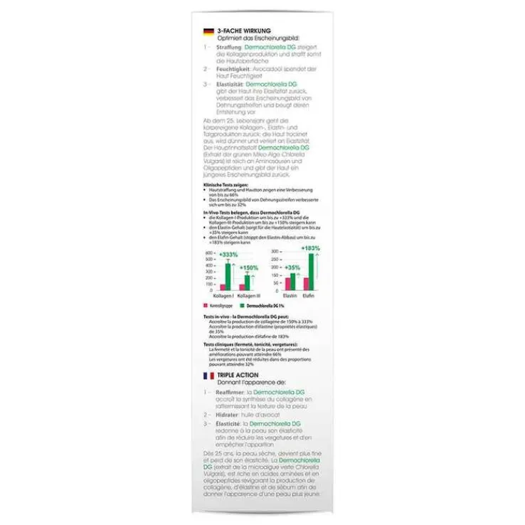- Straffung: Dermochlorella DP steigert die Kollagen-Produktion und strafft somit das Gewebe