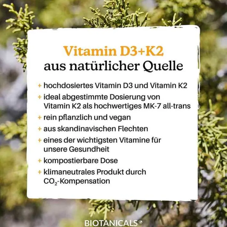 Das natürliche Vitamin D3+K2 von Biotanicals ist auch unter den Namen Cholecalciferol und Menachinon Mk-7 bekannt. Diese werden dem ursprünglichen Rohstoff der norwegischen Flechten extrahiert. Von Biotanicals gibt es endlich ein natürliches Vitamin D3+K2-Präparat aus rein pflanzlicher Quelle – ideal für eine vegane Ernährung.