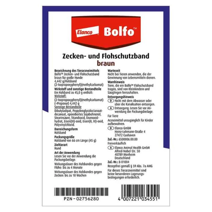 Warnhinweis: Tiere, die ein Bolfo® Zecken- und Flohschutzband tragen, sind von Kleinkindern und Säuglingen fernzuhalten.