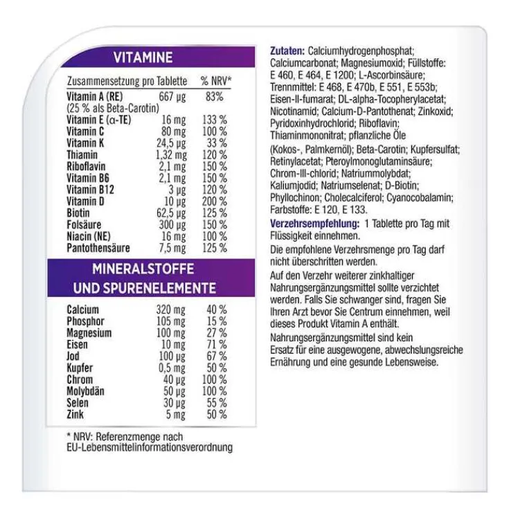 Calciumhydrogenphosphat; Calciumcarbonat; Magnesiumoxid; Füllstoffe: E 460, E 464, E 1200; L-Ascorbinsäure; Trennmittel: E 468, E 470b, E 551, E 553b; Eisen-II-fumarat; DL-alpha-Tocopherylacetat; Nicotinamid; Calcium-D-Pantothenat; Zinkoxid; Pyridoxinhydrochlorid; Riboflavin; Thiaminmononitrat; pflanzliche Öle (Kokos-, Palmkernöl); Beta-Carotin; Kupfersulfat; Retinylacetat; Pteroylmonoglutaminsäure; Chrom-III-chlorid; Natriummolybdat; Kaliumjodid; Natriumselenat; D-Biotin; Phyllochinon; Cholecalciferol; Cyanocobalamin; Farbstoffe: E 120, E 133.