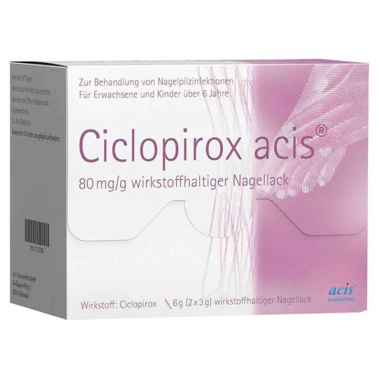 Ciclopirox acis® 80 mg/g wirkstoffhaltiger Nagellack Wirkstoff: Ciclopirox. Anwendungsgebiete: Ciclopirox acis Nagellack wurde speziell für die Behandlung von Nagelpilzinfektionen entwickelt. Der Wirkstoff Ciclopirox durchdringt die Nagelplatte und hat eine pilzabtötende Wirkung auf alle wichtigen Erreger, die Nagelpilzinfektionen verursachen. Ciclopirox acis Nagellack wird für die Behandlung von Nagelpilzinfektionen angewendet. Wenn Sie sich nach 6 Monaten nicht besser oder gar schlechter fühlen, wenden Sie sich an Ihren Arzt. Zu Risiken und Nebenwirkungen lesen Sie die Packungsbeilage und fragen Sie Ihre Ärztin, Ihren Arzt oder in Ihrer Apotheke. Stand: 01/2020.