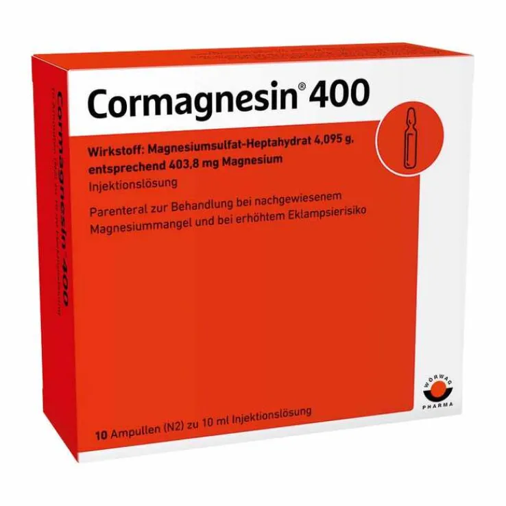 Cormagnesin® 400. Wirkstoff: Magnesiumsulfat-Heptahydrat. Anwendungsgebiete: Magnesiummangel, wenn er Ursache für Stör. d. Muskeltätigkeit ist u. eine orale Therapie nicht möglich ist; Therapie von Präeklampsie u. Eklampsie. Zu Risiken und Nebenwirkungen lesen Sie die Packungsbeilage und fragen Sie Ihre Ärztin, Ihren Arzt oder in Ihrer Apotheke. Wörwag Pharma GmbH & Co. KG, 71034 Böblingen