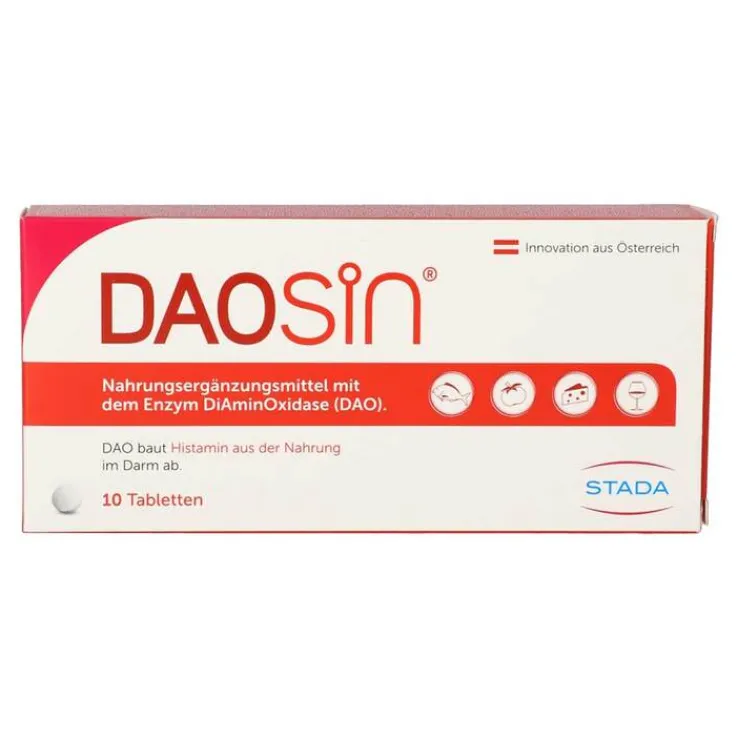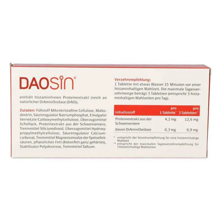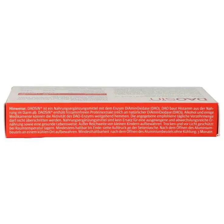 DAOSiN® ist ein Nahrungsergänzungsmittel mit dem Enzym DiAminOxidase (DAO) und ergänzt das körpereigene DAO-Enzym zum Histaminabbau aus der Nahrung.