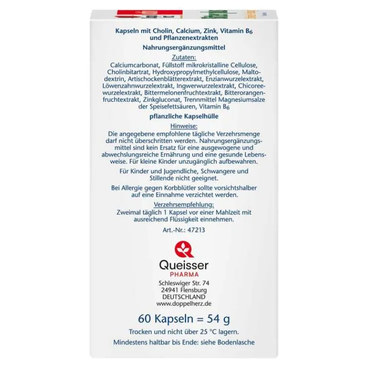 Calciumcarbonat, Füllstoff mikrokristalline Cellulose, Cholinbitartrat, Hydroxypropylmethylcellulose, Maltodextrin, Artischockenblätterextrakt, Enzianwurzelextrakt, Löwenzahnwurzelextrakt, Ingwerwurzelextrakt, Chicoreewurzelextrakt, Bittermelonenfruchtextrakt, Bitterorangenfruchtextrakt, Zinkgluconat, Trennmittel Magnesiumsalze der Speisefettsäuren, Vitamin B6