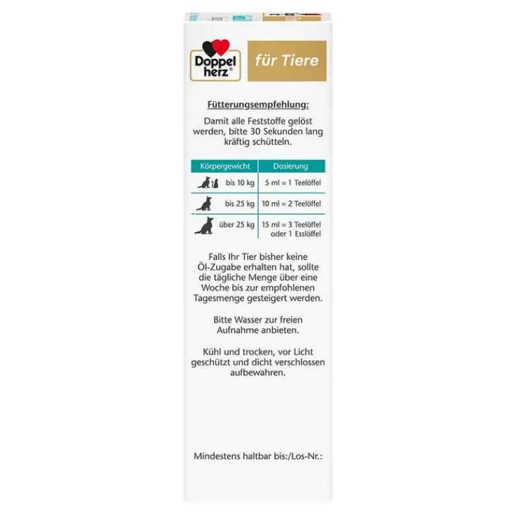 Falls Ihr Tier bisher keine Öl-Zugabe erhalten hat, sollte die tägliche Menge über eine Woche bis zur empfohlenen Tagesmenge gesteigert werden. Empfohlene Fütterungsdauer zunächst bis zu 3 Monate. Es wird empfohlen, vor der Verwendung oder der Verlängerung der Fütterungsdauer den Rat eines Tierarztes einzuholen.