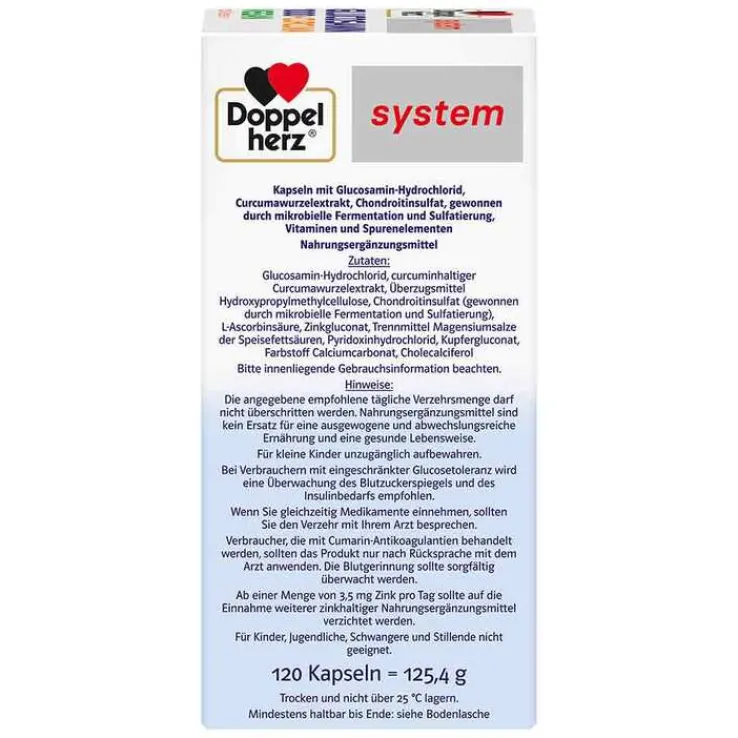 Doppelherz system Glucosamin 1.000 + Curcuma vegan enthält eine spezielle Kombination der lebenswichtigen Mikronährstoffe Kupfer, Zink, Vitamin C, Vitamin B6 und Vitamin D. Zusätzlich sind 1.000 mg Glucosamin-Hydrochlorid, 200 mg MSM (Methylsulfonylmethan) und 500 mg Curcumawurzelextrakt bei Einnahme von 2 Kapseln enthalten.