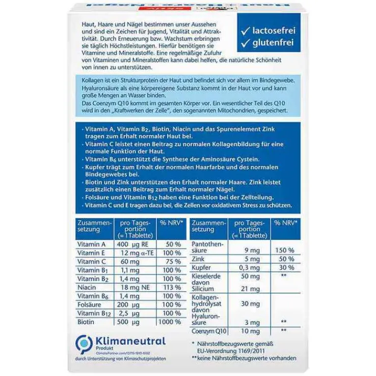 * Vitamin A, Vitamin B2, Biotin, Niacin und das Spurenelement Zink tragen zum Erhalt normaler Haut bei. Folsäure hat wie Vitamin B12 eine Funktion bei der Zellteilung. Vitamin C trägt zu einer normalen Kollagenbildung für eine normale Funktion der Haut bei. Vitamin B6 trägt zu einer normalen Cystein-Synthese bei. Kupfer trägt zu einer normalen Haarpigmentierung bei. Kupfer trägt zur Erhaltung von normalem Bindegewebe bei. Biotin und Zink tragen zur Erhaltung normaler Haut bei.Zink trägt zur Erhaltung normaler Nägel bei. Vitamin C und E tragen dazu bei, die Zellen vor oxidativem Stress zu schützen.