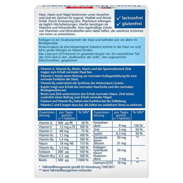 * Vitamin A, Vitamin B2, Biotin, Niacin und das Spurenelement Zink tragen zum Erhalt normaler Haut bei. Folsäure hat wie Vitamin B12 eine Funktion bei der Zellteilung. Vitamin C trägt zu einer normalen Kollagenbildung für eine normale Funktion der Haut bei. Vitamin B6 trägt zu einer normalen Cystein-Synthese bei. Kupfer trägt zu einer normalen Haarpigmentierung bei. Kupfer trägt zur Erhaltung von normalem Bindegewebe bei. Biotin und Zink tragen zur Erhaltung normaler Haut bei.Zink trägt zur Erhaltung normaler Nägel bei. Vitamin C und E tragen dazu bei, die Zellen vor oxidativem Stress zu schützen.