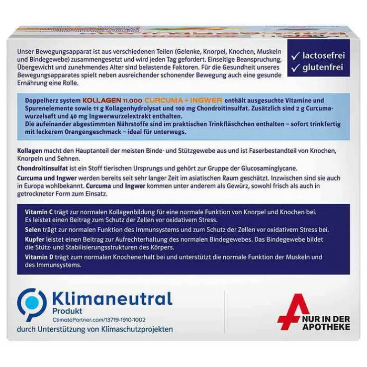 Doppelherz System Kollagen 11.000 Curcuma + Ingwer enthält ausgesuchte Vitamine, Spurenelemente, Kollagenhydrolysat und Chondroitinsulfat. Zusätzlich sind Curcumawurzelsaft und Ingwerwurzelextrakt enthalten. Die Nährstoffe sind optimal aufeinander abgestimmt. Die Trinkampullen sind sofort trinkfertig und mit leckerem Orangen-Geschmack, also bestens für unterwegs geeignet.