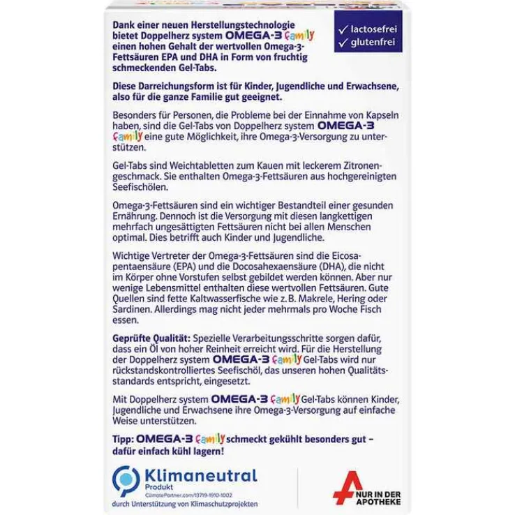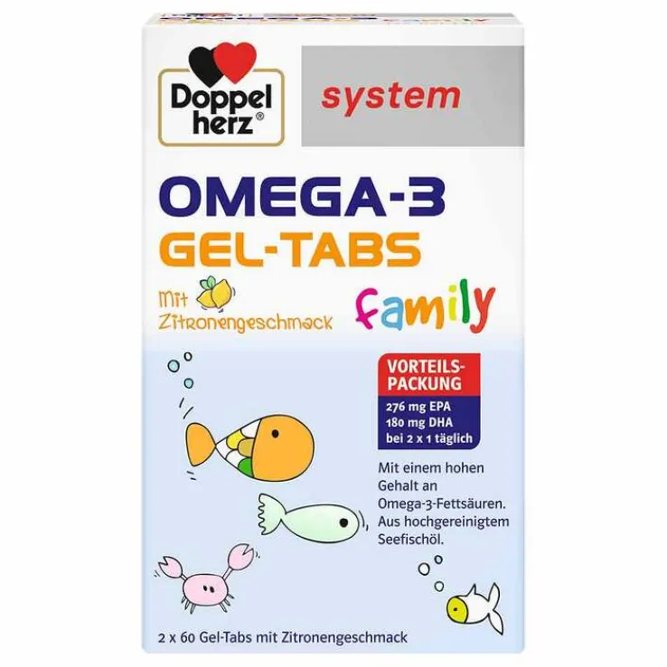 Aufgrund einer neuen Herstellungstechnologie bietet Doppelherz system Omega-3 family nun einen hohen Gehalt der wertvollen Omega-3-Fettsäuren EPA und DHA in Form von fruchtig schmeckenden Gel-Tabs. Diese Darreichungsform ist für alle, die keine Kapseln schlucken möchten, sehr gut geeignet.