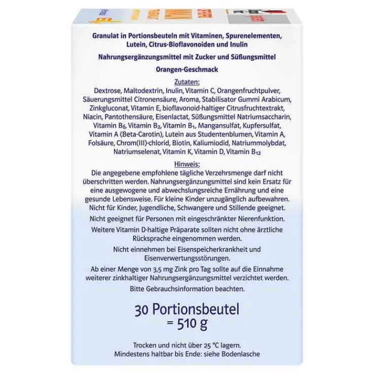 Dextrose, Maltodextrin, Inulin, Vitamin C, Orangenfruchtpulver, Säuerungsmittel Citronensäure, Aroma, Stabilisator Gummi Arabicum, Zinkgluconat, Vitamin E, Bioflavonoid-haltiger Citrusfruchtextrakt, Niacin, Pantothensäure, Eisenlactat, Süßungmittel Natriumsaccharin, Vitamin B6, Vitamin B2, Vitamin B1, Mangansulfat, Kupfersulfat, Vitamin A (Beta-Carotin), Lutein aus Studentenblumen, Vitamin A, Folsäure, Chrom(III)-chlorid, Biotin, Kaliumiodid, Natriummolybdat, Natriumselenat, Vitamin K, Vitamin D, Vitamin B12.