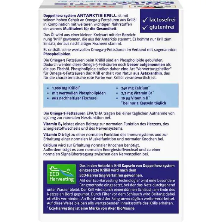 Doppelherz system Antarktis Krill bietet zusätzlich zu dem hohen Gehalt an Krill-Omega-3-Fettsäuren eine Kombination mit Calcium, Vitamin D und Vitamin B1. Damit betrifft es die normale Funktion des Herzens, der Knochen und Muskeln sowie des Immunsystems und der Nerven: