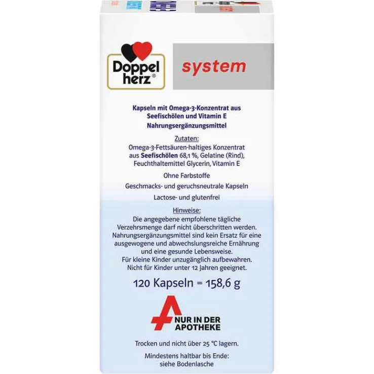 Die Doppelherz system-Kapseln enthalten 900 mg Omega-3-Konzentrat aus Seefischölen, das 60 % an Omega-3-Fettsäuren enthält. Viele andere herkömmliche Fischöle enthalten nur 30 % Omega-3-Fettsäuren. Aufgrund dieser hohen Konzentration von Omega-3-Fettsäuren verringert sich die tägliche Einnahmemenge auf nur 1 Kapsel täglich!