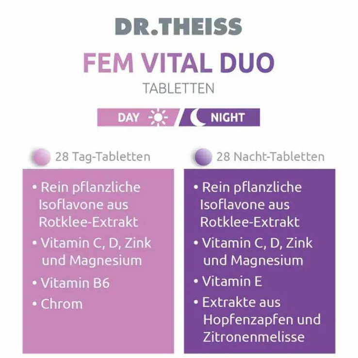 DR. THEISS Fem Vital Duo Tabletten für den Tag und für die Nacht kombinieren verschiedene Vitamine und Mineralstoffe, die den Körper unterstützen: