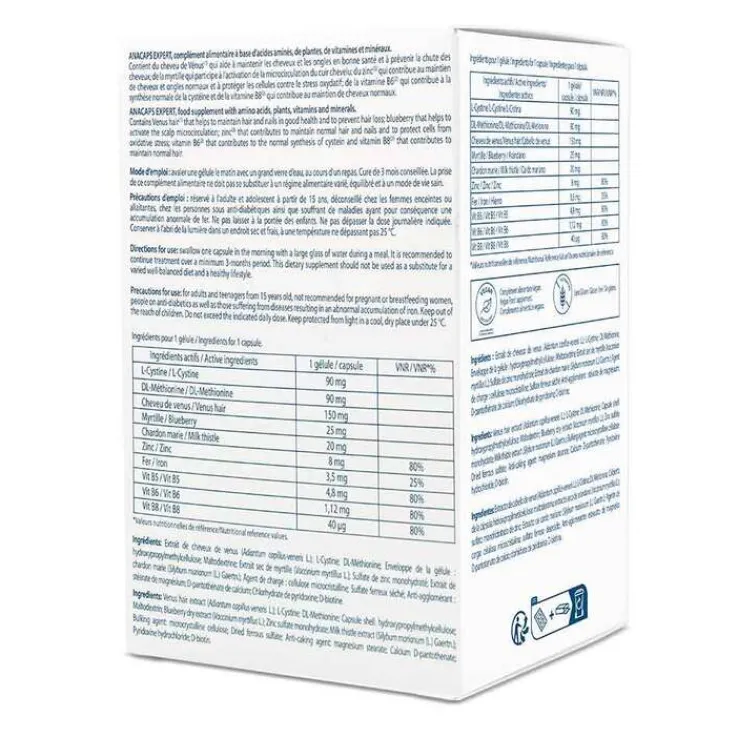 VENUSHAAR-EXTRAKT (ADIANTUM CAPILLUS-VENERIS L.); L-CYSTIN; DL-METHIONIN; HYDROXYPROPYLMETHYLCELLULOSE (KAPSELHÜLLE); MALTODEXTRIN; HEIDELBEER-EXTRAKT (VACCINIUM MYRTILLUS L.); ZINKSULFAT MONOHYDRAT; MARIENDISTEL-EXTRAKT (SILYBUM MARIANUM (L.)GAERTN.); FÜLLSTOFF: MIKROKRISTALLINE CELLULOSE; EISENSULFAT; TRENNMITTEL: MAGNESIUMSALZE DER SPEISEFETTSÄUREN; CALCIUM-D-PANTOTHENAT; PYRIDOXINHYDROCHLORID; D-BIOTIN.