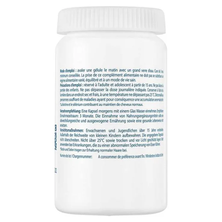 L-CYSTIN; DL-METHIONIN; HYDROXYPROPYLMETHYLCELLULOSE (KAPSELHÜLLE); FÜLLSTOFF: MIKROKRISTALLINE CELLULOSE; SCHACHTELHALM-EXTRAKT (EQUISETUM ARVENSE L.); HEIDELBEER-EXTRAKT (VACCINIUM MYRTILLUS L.); EISENSULFAT; NIACIN; TRENNMITTEL: MAGNESIUMSALZE DER SPEISEFETTSÄUREN; VITAMIN B6; NATRIUMSELENIT; BIOTIN.