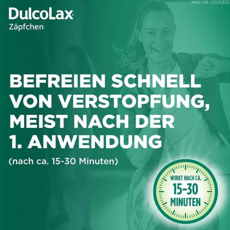 DulcoLax® Zäpfchen. Wirkstoff: Bisacodyl. Anwendungsgebiet: Zur Anwendung bei Verstopfung, bei Erkrankungen, die eine erleichterte Darmentleerung erfordern sowie zur Darmentleerung bei Behandlungsmaßnahmen u. Maßnahmen zum Erkennen von Krankheiten (therapeut. u. diagnost. Eingriffe) am Darm. Warnhinweis: Wie andere Abführmittel sollten DulcoLax® Zäpfchen ohne ärztl. Abklärung der Verstopfungsursache nicht täglich oder über einen längeren Zeitraum angewendet werden. Anwendung trägt nicht zur Gewichtsreduktion bei. Der gleichzeitige Gebrauch von anderen Abführmitteln kann die Nebenwirkungen im Magen-Darmtrakt verstärken. Apothekenpflichtig. Zu Risiken und Nebenwirkungen lesen Sie die Packungsbeilage und fragen Sie Ihre Ärztin, Ihren Arzt oder in Ihrer Apotheke. A. Nattermann & Cie. GmbH, Brüningstraße 50, 65929 Frankfurt am Main Stand: August 2023