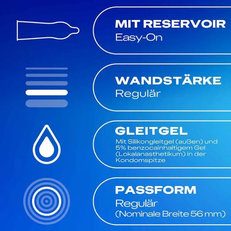 Bei manchen Menschen kann das benzocainhaltige Gel, das in der Kondomspitze enthalten ist, einen Ausschlag, Reizung, Brennen oder Juckreiz verursachen. Sollte dies der Fall sein, Kontakt mit Augen, gereizter Haut und Wunden vermeiden und nach der Anwendung abwaschen. Das Produkt nicht mehr anwenden. Wenn keine Besserung eintritt, sollte ein Arzt aufgesucht werden. STOPPE SOFORT DIE VERWENDUNG UND RUFE EINEN ARZT AN: Wenn du oder dein(e) Partner(in) bei der Verwendung des Kondoms Atembeschwerden haben oder blaue Lippen bekommen. Vorzeitiger Samenerguss ist ein häufiges Problem, das viele Ursachen haben kann und möglicherweise ärztliche Beratung / Überwachung erfordert. Wenn diese Kondome nicht helfen, solltest du deinen Arzt konsultieren.