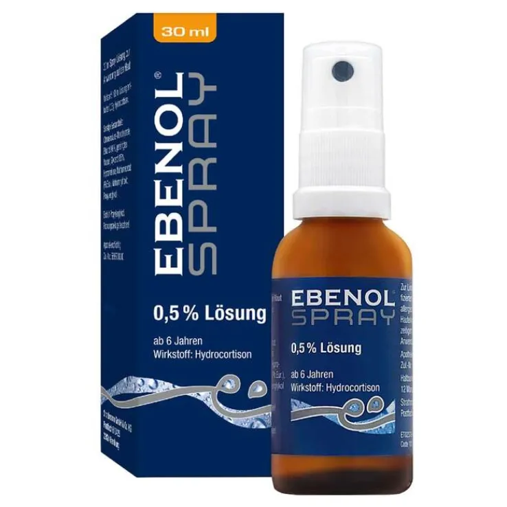 EBENOL® Spray 0,5 % Lösung. Für Erwachsene und Kinder ab 6 Jahren. Wirkstoff: Hydrocortison. Anwendungsgebiet: Zur Linderung von nicht infizierten leichten entzündlichen, allergischen und juckenden Hauterkrankungen, die auf eine symptomatische Behandlung mit schwach wirksamen Glucocorticosteroiden ansprechen. EBENOL® Spray eignet sich vorzugsweise zur Anwendung auf normaler oder fettiger Haut. Zur kurzzeitigen (maximal 2 Wochen andauernden) äußerlichen Anwendung bei Erwachsenen und Kindern ab dem vollendeten 6. Lebensjahr. Warnhinweis: enthält Propylenglykol und Ethanol (Alkohol). Packungsbeilage beachten. Stand: 07.2023. Zu Risiken und Nebenwirkungen lesen Sie die Packungsbeilage und fragen Sie. Ihre Ärztin, Ihren Arzt oder in Ihrer Apotheke.