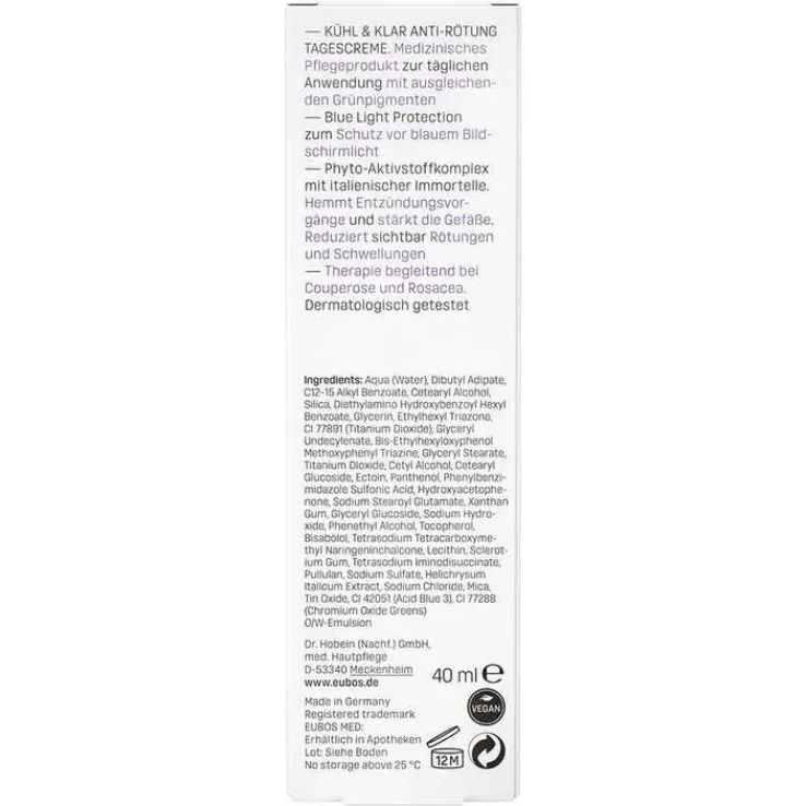 Eubos Kühl & Klar Anti-Rötung Tagescreme ist ein medizinisches Pflegeprodukt zur täglichen Anwendung mit ausgleichenden Grünpigmenten. Das Produkt ist mit Blue Light Protection zum Schutz vor blauem Bildschirmlicht. Der Phyto-Aktivstoffkomplex mit italienischer Immortelle hemmt Entzündungsvorgänge und stärkt die Gefäße. Er reduziert sichtbar Rötungen und Schwellungen und ist Therapie begleitend bei Couperose und Rosacea einsetzbar. Die Tagescreme wurde dermatologisch getestet.