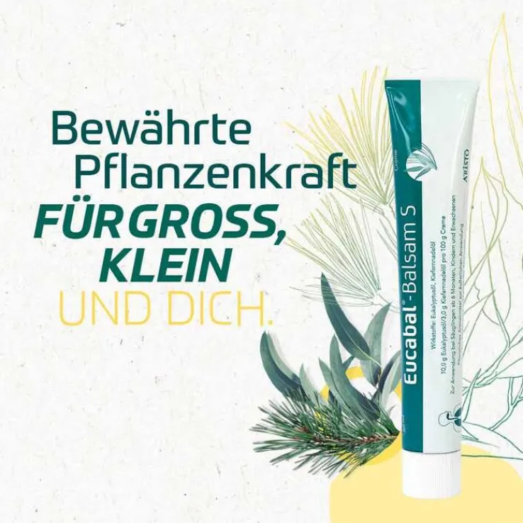 Eucabal®-Balsam S Creme. (Ap). Wirkstoffe: Eukalyptusöl, Kiefernnadelöl. Zur Besserung der Beschwerden bei Erkältungskrankheiten der Atemwege mit zähflüssigem Schleim. Zu Risiken und Nebenwirkungen lesen Sie die Packungsbeilage und fragen Sie Ihre Ärztin, Ihren Arzt oder in Ihrer Apotheke. Enthält Cetylstearylalkohol. Packungsbeilage beachten. (Stand Januar 2020). Aristo Pharma GmbH, Wallenroder Str. 8-10, 13435 Berlin.