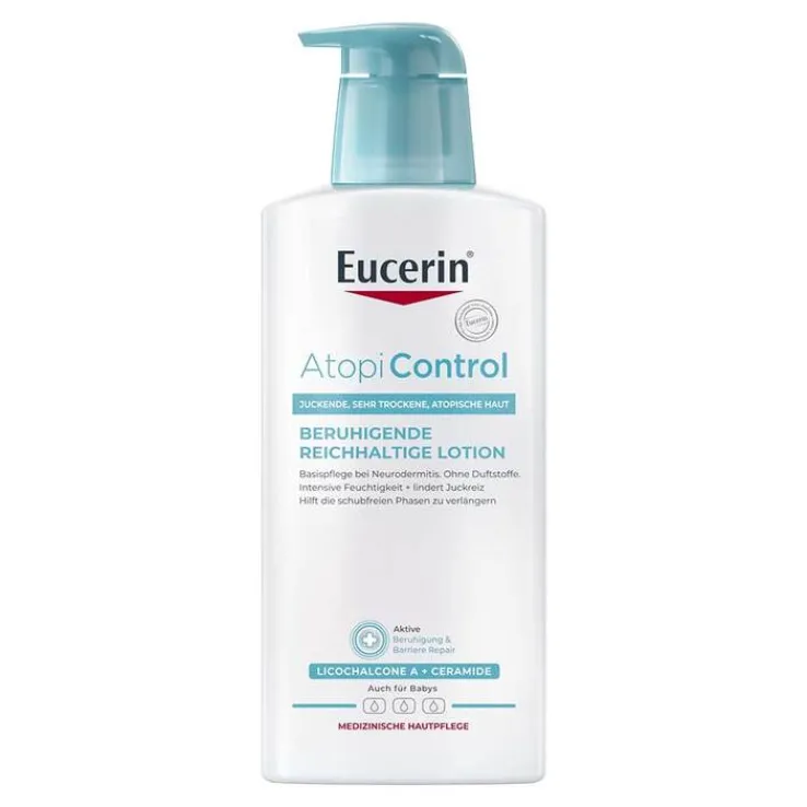 Die Eucerin AtopiControl Lotion ist eine schnell einziehende und beruhigende Bodylotion. Sie eignet sich zur Anwendung während eines akuten Neurodermitisschubs oder zur täglichen Hautpflege. Die feuchtigkeitsspendende Wasser-in-Öl-Lotion beruhigt atopische Haut und sorgt für ein spürbar geschmeidiges Hautgefühl.