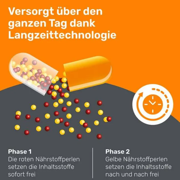 Die einzigartige Langzeittechnologie verbessert die Aufnahme von Nährstoffen durch eine spezielle Kombination von schnell und langsam freigesetzten Perlen. Fast alle wasserlöslichen Vitamine werden über mehrere Stunden nach und nach freigesetzt. Lediglich bei Vitamin B12 und Folsäure wurde bewusst auf eine zeitverzögerte Freisetzung verzichtet, um eine optimale Aufnahme zu gewährleisten.