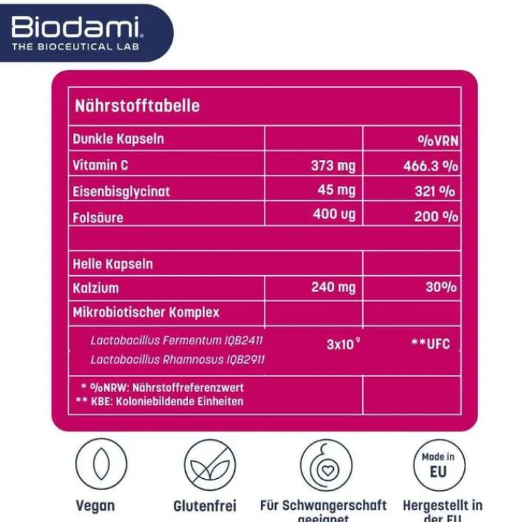 * Eisen und Folat tragen zur Verringerung von Müdigkeit und Ermüdung bei. Eisen trägt zu einer normalen kognitiven Funktion bei. Eisen, Vitamin C und Calcium tragen zu einem normalen Energiestoffwechsel bei. Eisen trägt zur normalen Bildung von roten Blutkörperchen und Hämoglobin bei. Eisen trägt zu einem normalen Sauerstofftransport im Körper bei. Eisen und Folat haben eine Funktion bei der Zellteilung. Calcium hat eine Funktion bei der Zellteilung und -spezialisierung. Vitamin C trägt zu einer normalen Funktion des Nervensystems bei. Vitamin C und Eisen tragen zur normalen psychischen Funktion bei. Vitamin C trägt dazu bei, die Zellen vor oxidativem Stress zu schützen. Vitamin C erhöht die Eisenaufnahme. Folat trägt zum Wachstum des mütterlichen Gewebes während der Schwangerschaft bei. Folat trägt zu einer normalen Blutbildung bei.