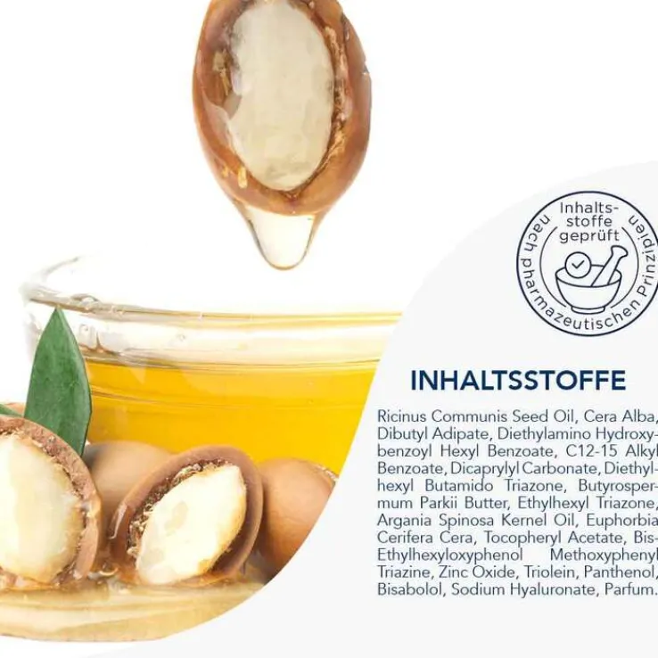 - mit Arganöl, Bienenwachs, Bisabolol, Candelillawachs, Lagkettigem Hyaluron, Rizinusöl, Shea Butter, Vitamin E und Panthenol