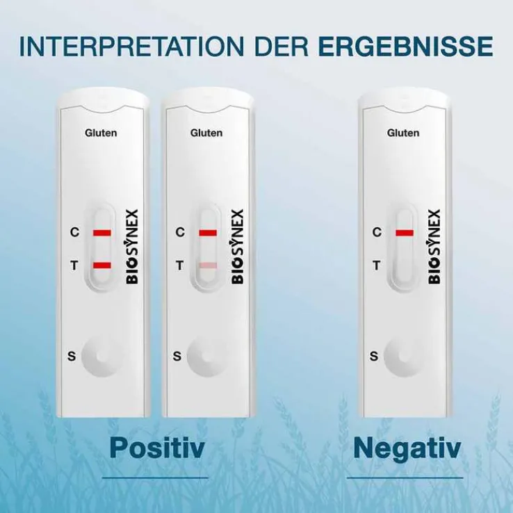 Achtung: Es gibt auch andere Arten von Überempfindlichkeiten mit Symptomen, die auf funktionelle Verdauungsstörungen und/oder allergische Reaktionen bei nicht zöliakiebetroffenen Personen hinweisen. Wenn trotz eines NEGATIVEN Ergebnisses des Biosynex Gluten-Selbsttests die Symptome bei glutenhaltiger Ernährung anhalten, konsultieren Sie einen Arzt.
