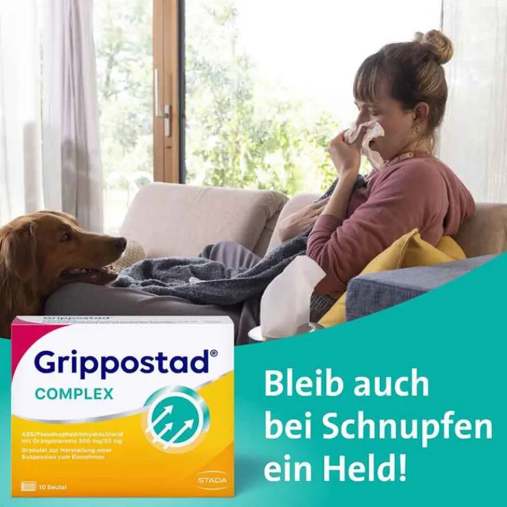Grippostad® COMPLEX ASS/Pseudoephedrinhydrochlorid mit Orangenaroma 500 mg/30 mg Granulat zur Herstellung einer Suspension zum Einnehmen Zur Anwendung bei Erwachsenen und Jugendlichen ab 16 Jahren. Wirkstoffe: Acetylsalicylsäure / Pseudoephedrinhydrochlorid. Zur Behandlung von Symptomen der Nasen-/Nasennebenhöhlenverstopfung (Rhinosinusitis), Schmerzen und Fieber im Zusammenhang mit Erkältung und/oder grippeähnlichen Symptomen. Wenn Sie nur eine der oben genannten Beschwerden haben, kann es effektiver sein, ein Arzneimittel einzunehmen, das nur einen der Wirkstoffe enthält. Wenn Sie sich nach 3 Tagen nicht besser oder gar schlechter fühlen, wenden Sie sich an Ihren Arzt. Hinweis: Enthält Saccharose. Zu Risiken und Nebenwirkungen lesen Sie die Packungsbeilage und fragen Sie Ihre Ärztin, Ihren Arzt oder in Ihrer Apotheke. STADA Consumer Health Deutschland GmbH, Stadastraße 2–18, 61118 Bad Vilbel Stand: April 2024