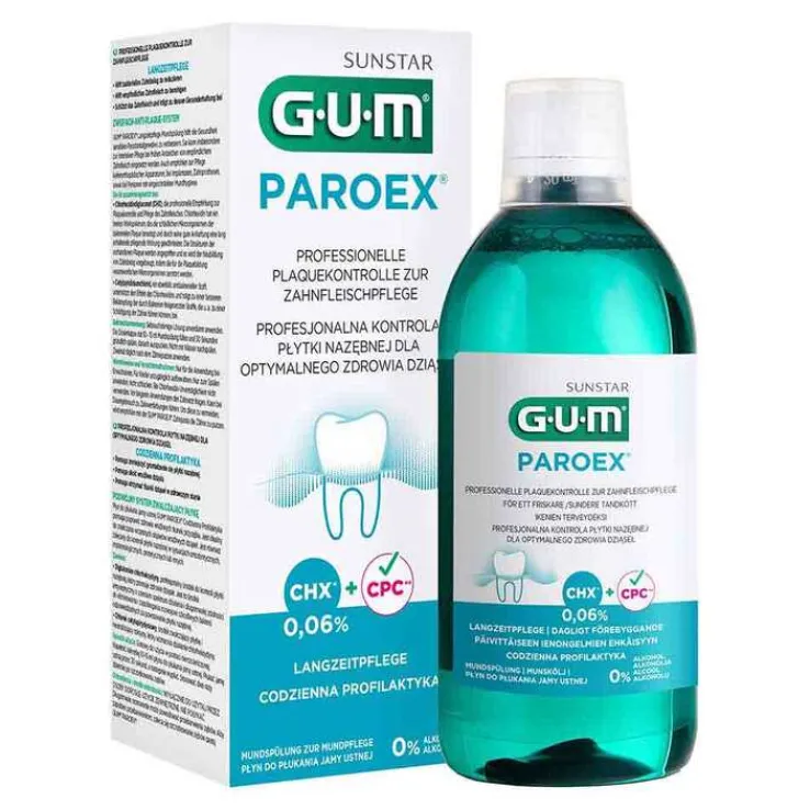 Die GUM Paroex 0,06 % CHX Mundspülung fördert den langfristigen Schutz vor Zahnfleischproblemen und beugt Gingivitis vor. Der antibakterielle Stoff Chlorhexidin (0,06 % CHX) hemmt das Wachstum und die Vermehrung der Bakterien, Cetylpyridiniumchlorid (0,05 % CPC) neutralisiert die schädlichen Stoffwechsel- und Abfallprodukte der Mikroorganismen.
