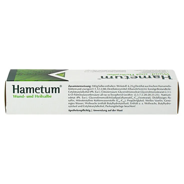 Hametum® Wund- und Heilsalbe. Wirkstoff: Hamamelisdestillat. Anwendungsgebiete: Leichte Hautverletzungen, kleinflächige Entzündungen der Haut und Schleimhäute. Bei großflächigen oder eitrig infizierten Wunden ist die Rücksprache mit einem Arzt erforderlich. Zu Risiken und Nebenwirkungen lesen Sie die Packungsbeilage und fragen Sie Ihre Ärztin, Ihren Arzt oder in Ihrer Apotheke. Dr. Willmar Schwabe GmbH & Co. KG – Karlsruhe