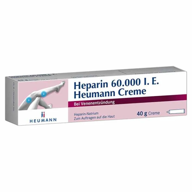 Heparin 60.000 I.E. Heumann Creme (Wirkstoff: Heparin-Natrium) Anw.: Zur unterstützenden Behandlung bei akuten Schwellungszuständen nach stumpfen Verletzungen (Prellungen/Blutergüsse) und oberflächlicher Venenentzündung, sofern diese nicht durch Kompression behandelt werden kann. Stand: 11/2023 Zu Risiken und Nebenwirkungen lesen Sie die Packungsbeilage und fragen Sie Ihre Ärztin, Ihren Arzt oder in Ihrer Apotheke.