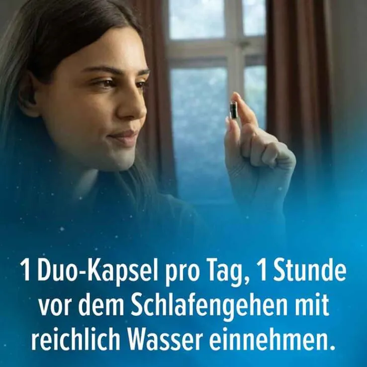 1 Duo-Kapsel pro Tag, 1 Stunde vot dem Schlafengehen mit reichlich Wasser verzehren.