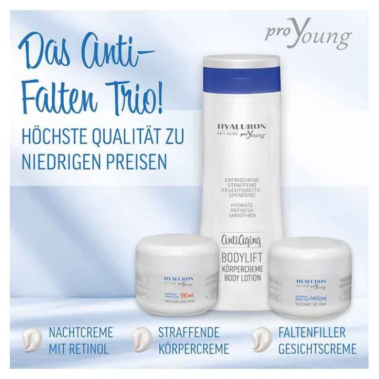 Die Hyaluron Proyoung Anti Aging Faltenfiller Nachtcreme zeichnet sich durch die ausgewogene Kombination von Hyaluronsäure, Aloe Vera und Retinol aus. Die Haut wird über Nacht entspannt, regeneriert und optimal gepflegt.