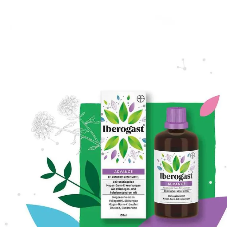 Iberogast® ADVANCE. Pflanzliches Arzneimittel bei Magen-Darm-Erkrankungen. Behandlung von funktionellen Magen-Darm-Erkrankungen wie Reizmagensyndrom (funktionelle Dyspepsie) und Reizdarmsyndrom (Colon irritabile). Das Arzneimittel enthält 240 mg Alkohol (Ethanol) pro 20 Tropfen. Stand: 09/2023. Bayer Vital GmbH, Kaiser-Wilhelm-Allee 70, 51373 Leverkusen, Deutschland. Zu Risiken und Nebenwirkungen lesen Sie die Packungsbeilage und fragen Sie Ihre Ärztin, Ihren Arzt oder in Ihrer Apotheke.